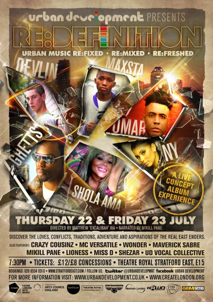 To celebrate Re:Definition 2010, Urban Development’s essential summer showcase, we are offering 5 pairs of exclusive backstage passes to your readers. The show features the likes of Ghetts, Shola Ama, Omar, Crazy Cousinz, NY, Devlin, Maxsta and promises to be a unique musical excursion. A co-production with Urban Development, Theatre Royal Stratford East and The Barbican, Re:Defintion explores East London’s rich past, present and exciting future through the eyes of its homegrown talent.