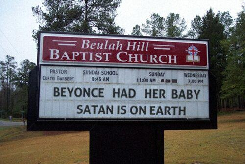 According to TMZ the pastor of Beulah Hill Baptist Church discovered the vandalism yesterday after receiving numerous complaints from locals and removed it immediately. The pastor insists, the church had nothing to do with the apocalyptic message … it was simply the victim in a random act of mischief.