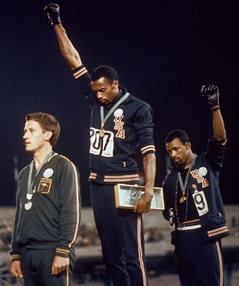 Famous photograph: Tommie Smith (centre), John Carlos (right) and Australian Peter Norman (front) at the 1968 Olympics in Mexico