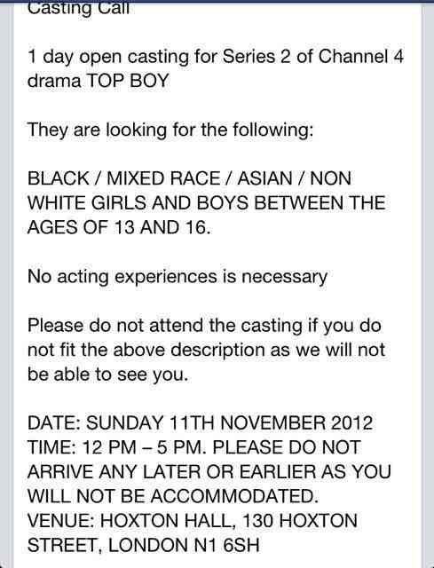 Open casting call for teens and no whites?? You’d never think Top Boy was written by a white man….or would you?