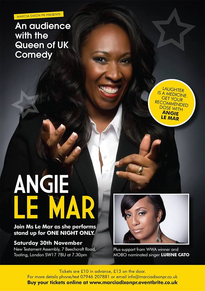The event will feature the Queen of UK Comedy, performer, presenter, producer, actress, writer, director ANGIE LE MAR in her first stand up show for 10 years, and Award winning and most recently MOBO and BEFFTA nominated gospel singer LURINE CATO.