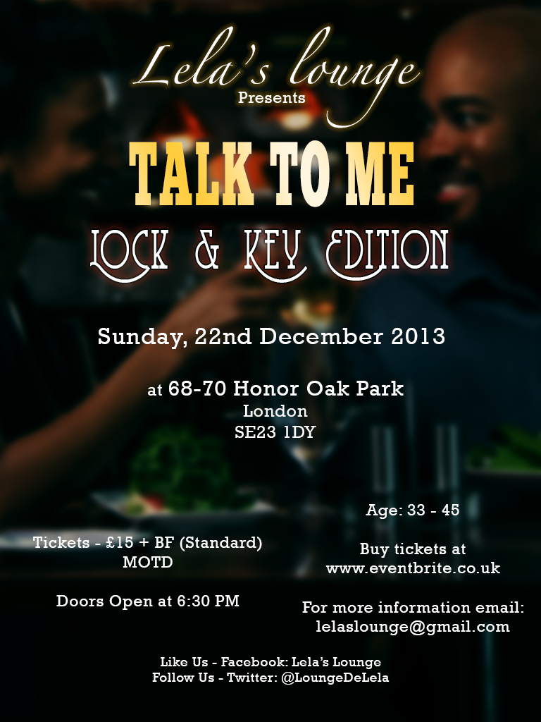 The Lela’s Lounge Team proudly presents “Talk To Me The Lock & Key Edition” A brand new singles event for the over 30s