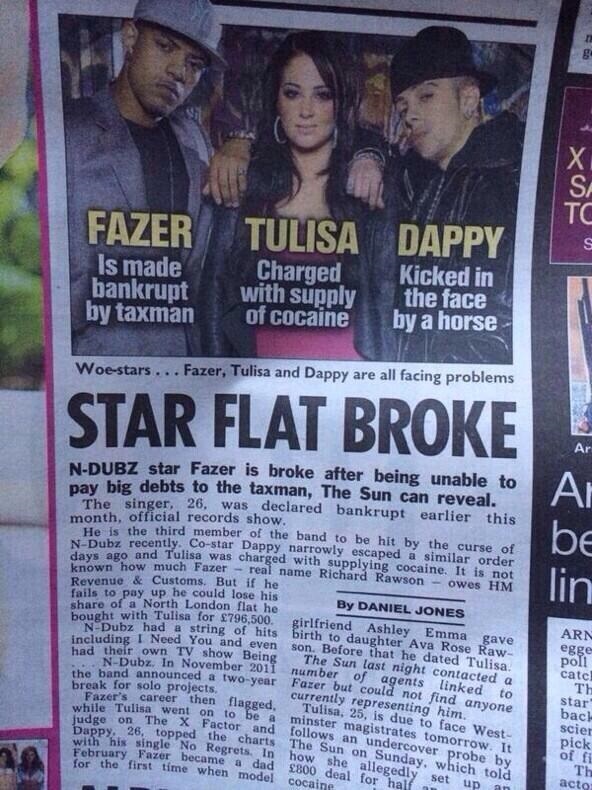 Tabloid rag The Sun reports that N-Dubz star Fazer (real name Richard Rawson) has been declared bankrupt. According to the newspaper official records show that the star, 26, was made bankrupt earlier this month.