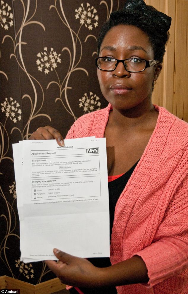 A black woman is demanding an apology from NHS chiefs after she was sent a letter saying her password was set as ‘charcoal shade’ for a hospital website.