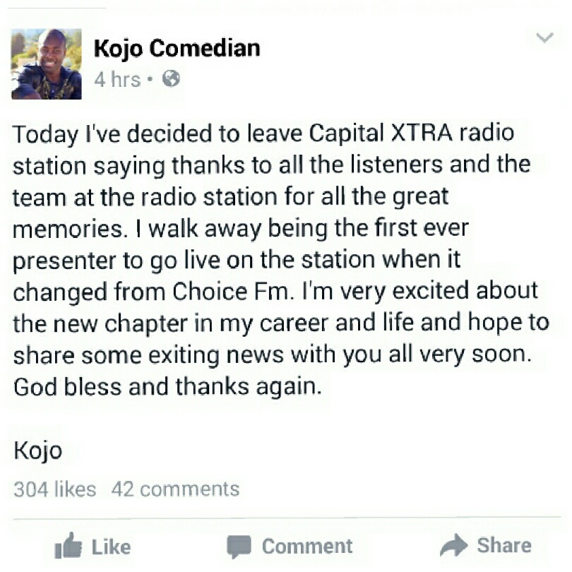 Capital XTRA presenter Kojo has announced via Facebook that he has decided to leave the station.