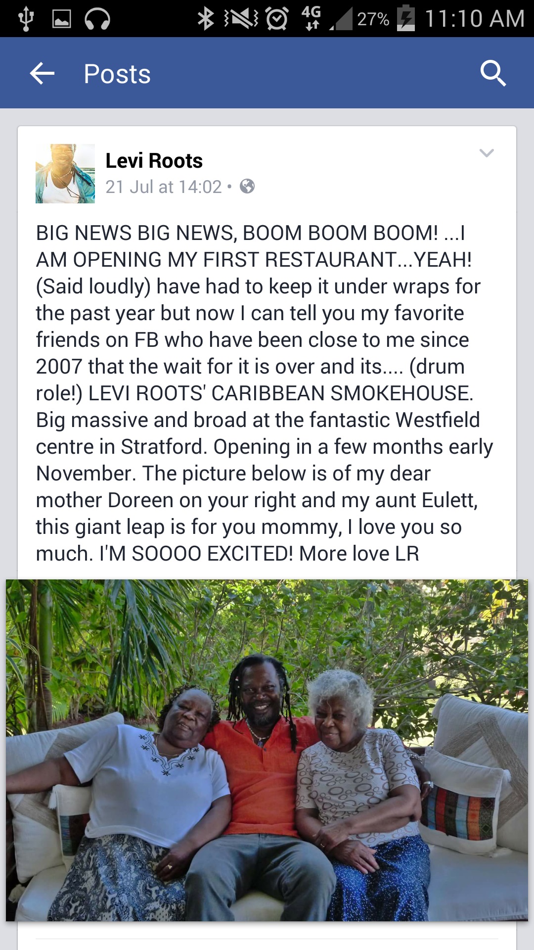 Levi Roots has announced that he will be opening the Levi Roots’ Caribbean Smokehouse in November.